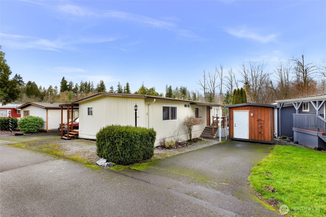 Charming home in Mill Wheel Mobile Home Park with a peaceful pond setting. This well-maintained residence offers a comfortable layout with generous living space, warm wood accents, and abundant natural light. The living room features large windows overlooking the pond and opens to a deck—perfect for relaxing or enjoying the tranquil surroundings.The kitchen provides ample cabinetry and flows easily into the main living areas, making the space functional and inviting. Outside, enjoy a private driveway, storage shed, and walk-down access to the pond’s edge from the deck. The setting feels serene while remaining conveniently located near Lake Whatcom, shopping, and major routes.Park approval is required. A great opportunity for affordable